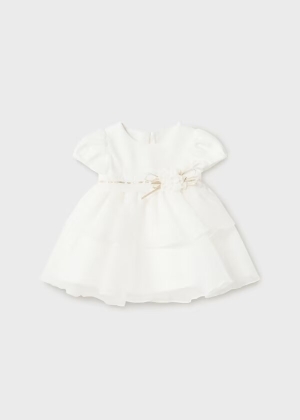 Elegante vestido de ceremonia para niña bebé en delicado tono marfil, cuidadosamente confeccionado combinando suave punto con tejido bordado de gran finura. El contraste de texturas aporta un aire refinado y especial, ideal para realzar la dulzura y comodidad de las más pequeñas. Un diseño lleno de encanto, perfecto para ceremonias, celebraciones familiares y momentos únicos en los que vestir con estilo y ternura.