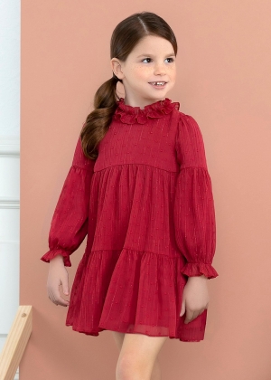Vestido fluido de niña en bambula rosa empolvado, con delicados detalles en lurex dorado. Mangas largas con elástico en el puño y forro interior de algodón para mayor comodidad. Ideal para ocasiones especiales y looks elegantes.