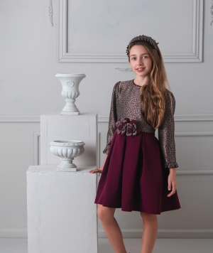 Elegante vestido de ceremonia para niña confeccionado en dos tejidos. Cuerpo en damasco azul marino con delicados hilos de lúrex plata que aportan un sutil brillo. Manga francesa y cierre trasero con cremallera invisible para un ajuste cómodo y seguro. Destaca su precioso detalle floral en la cintura, que realza la silueta. Falda de punto roma en azul con tablas, que aporta movimiento, estructura y comodidad. Ideal para bodas, comuniones, celebraciones y eventos especiales.