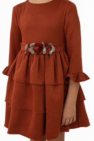 Vestido de ceremonia para niña confeccionado en suave punto roma gris, realzado con un exquisito brocado en negro y dorado que aporta brillo y distinción. Su delicado fajín floral enmarca la cintura, mientras la falda de volantes añade movimiento y encanto. La manga francesa completa un diseño refinado, perfecto para ocasiones especiales donde la elegancia es protagonista.