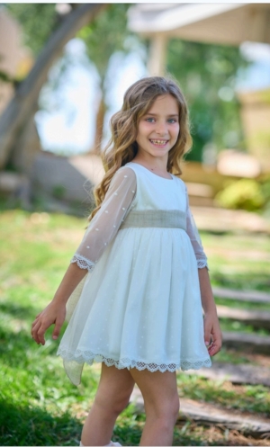 Vestido de niña para ceremonia en color blanco confeccionado en tejido ligero con delicados detalles bordados. Presenta mangas de tul semitransparente con encaje, falda vaporosa y elegante lazo en tono azul empolvado que realza la silueta. Su diseño refinado y cómodo lo convierte en la opción ideal para bodas, comuniones, arras, fiestas y eventos especiales. Un vestido infantil sofisticado, romántico y atemporal, perfecto para ocasiones formales y celebraciones donde se busca estilo y dulzura.