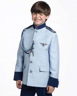 Imponente traje de almirante combinado de cinco piezas que destaca por su estilo ceremonial y su cuidada armonía de colores. La americana en azul tinta, con solapa clásica y delicados detalles celestes, aporta una presencia distinguida y sofisticada. El chaleco azul y la corbata en tono claro crean un contraste elegante que realza la uniformidad del conjunto. La chaqueta incorpora galones y un escudo bordado a juego, añadiendo un toque tradicional y refinado. El pantalón en azul tinta mantiene la coherencia del diseño, mientras que los gemelos, botones y demás detalles coordinados completan un look impecable. Un traje perfecto para grandes ocasiones, donde la elegancia y la distinción son protagonistas.