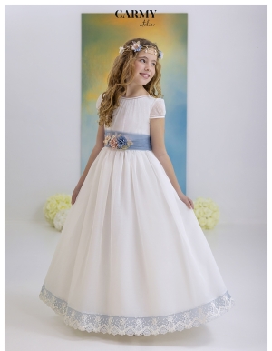 Un vestido de comunión de aura romántica, confeccionado en tul de topos en tono natural y embellecido con finas puntillas que realzan su delicadeza. Las mangas, adornadas con sutiles lazos, aportan un toque de dulzura, mientras que la exquisita composición floral en la espalda crea un efecto verdaderamente celestial. El tul en tono maquillaje añade una nota de distinción y sofisticación, convirtiendo esta pieza en una elección inolvidable.