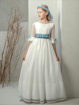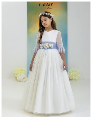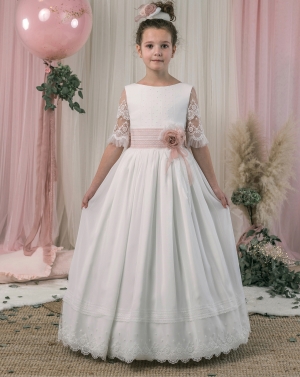 Un distinguido vestido de comunión elaborado en suave organza natural, realzado con delicadas vainicas y finas puntillas que aportan un aire de artesanía exquisita. La manga al codo, rematada con un sutil lazo, añade un toque de encanto clásico. Un cinturón de tul en verde empolvado, adornado con un pequeño broche floral, envuelve la cintura con dulzura. La espalda se luce con un elegante lazo final que completa esta creación llena de gracia y refinada belleza.