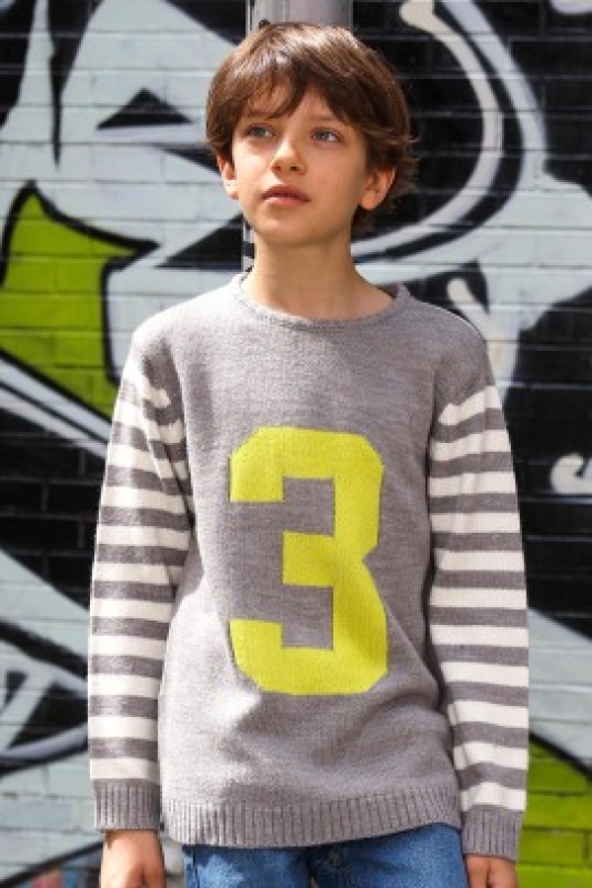Suéter tricot en gris con mangas combinadas en crudo y número central en verde