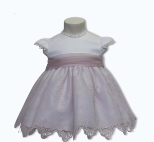Vestido de ceremonia para niña confeccionado en exquisito guipur blanco, ideal para ocasiones especiales. Presenta un delicado fajín en tono rosa con detalle floral que aporta un toque romántico y sofisticado. Las mangas cortas y la falda fruncida están rematadas con un elegante encaje festoneado a juego, creando un diseño armonioso y refinado. Incluye cierre abotonado en la espalda para un ajuste cómodo y braguita a juego, completando un conjunto perfecto para bautizos, celebraciones y eventos formales.