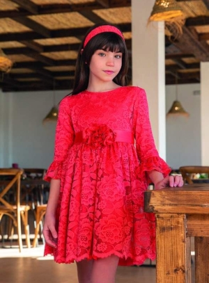 Vestido de ceremonia para niña confeccionado en lino rojo de alta calidad. Diseño refinado con manga francesa rematada en delicado volante, falda de amplio vuelo con volantes que aportan movimiento y sofisticación, y cinturón combinado para anudar en una elegante lazada. Cierre trasero con cremallera invisible para un ajuste cómodo y perfecto. Ideal para celebraciones, eventos especiales y ocasiones inolvidables.